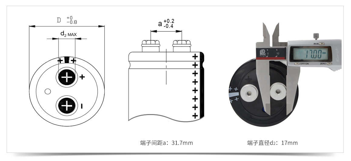 400V4700uF螺栓型電容器端子直徑為17mm,兩個端子間距為31.7mm,螺紋為:M6。