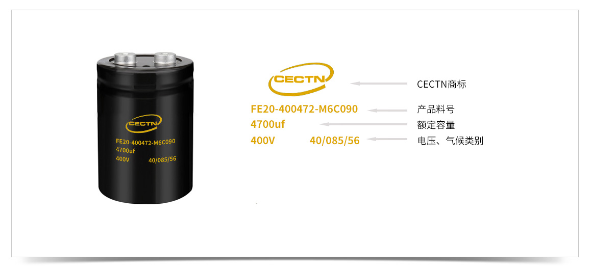 ? ? ? ? 鋁電解電容的料號又兩個部分組成,上面是CECTN商標(biāo),下面為電解電容型號,包含訂購代碼、電壓、容量、溫度、壽命、安裝方式等信息。詳細(xì)了解請點(diǎn)擊進(jìn)入《凱琦佳鋁電解電容料號說明》頁面。