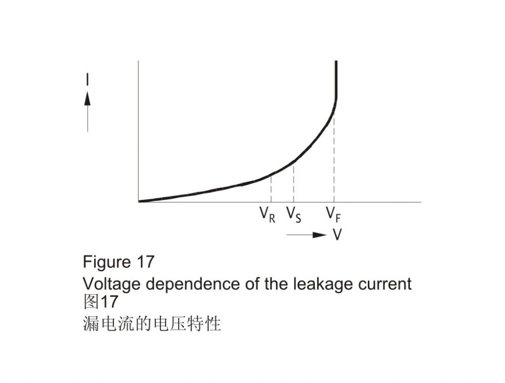 如圖15所示,在電壓加載至鋁電解電容器的前幾分鐘內,有一股很強的漏電流流過,特別是在長時間儲存期間未施加過電壓的情況下。在連續工作期間,漏電流會減小,直至幾乎恒定的“穩態”值。
