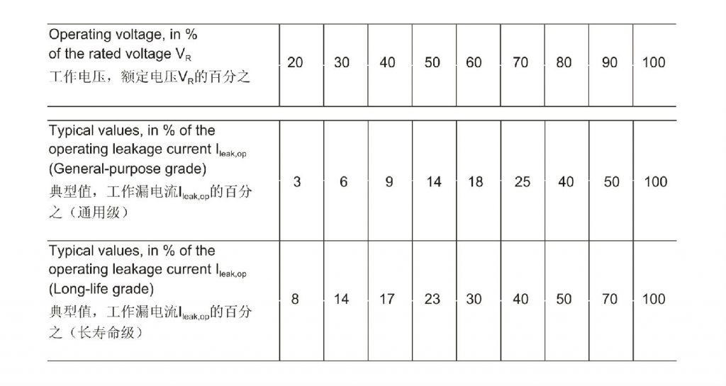 20℃溫度條件下取得的結果必須乘以以下因數,以取得通用和長壽命電容器工作漏電流的溫度特性。