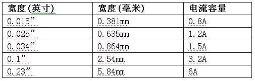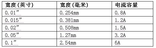 表1顯示了相對電流容量的小跡線寬度。這是基于1oz/ft2 (35μm)銅箔在跡線溫度升高20oC下的統計結果。