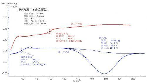 差示掃描量熱法(Differential Scanning Calorimetry)是在程序控溫下,測量輸入到物質與參比物質之間的功率差與溫度(或時間)關系的一種方法。DSC 在試樣和參比物容器下裝有兩組補償加熱絲,當試樣在加熱過程中由于熱效應與參比物之間出現溫差ΔT 時,可通過差熱放大電路和差動熱量補償放大器,使流入補償電熱絲的電流發生變化,而使兩邊熱量平衡,溫差ΔT 消失,并記錄試樣和參比物下兩只電熱補償的熱功率之差隨溫度(或時間)的變化關系,并根據這種變化關系,可研究分析材料的物理化學及熱力學性能。DSC 的應用廣泛,但在PCB 的分析方面主要用于測量PCB 上所用的各種高分子材料的固化程度(例如圖2)、玻璃態轉化溫度,這兩個參數決定著PCB 在后續工藝過程中的可靠性。