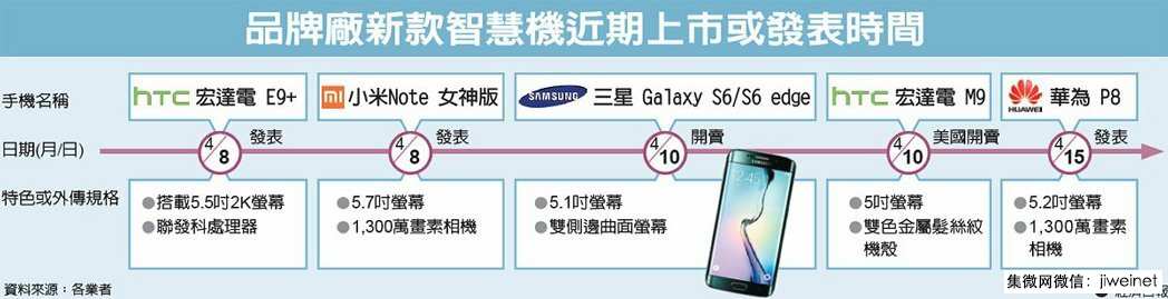 其中,宏達電將率先在本周三(8日)于中大陸發表新機,外傳5.5寸2K螢幕的E9+將現身,本周五(10日)宏達電新旗艦機HTC One M9將在美出貨。中大陸及美為全球前兩大智慧手機市場,宏達電在兩地的新機表現,對2季業績表現攸關重大。