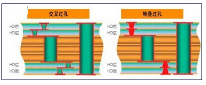 推薦使用深度多6層的盲孔/埋孔配置。層數(shù)再多會引起制造良率問題。優(yōu)選技術(shù)是使用交叉過孔或堆疊過孔,如圖8所示。交叉過孔允許更加精確的注冊公差,因為它們不像堆疊過孔那樣強制要求完美對齊。
