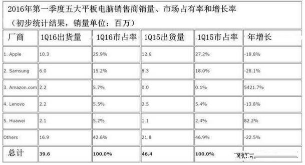 前兩大平板電腦制造商仍然保持著它們的地位:蘋果排在一名,三星排在二名。IDC公司稱,在2016年一季度,全球平板電腦的下滑主要是因為“季節(jié)性下滑”和“整體表現(xiàn)冷淡的消費者群體”。前五大平板電腦供應商占全球平板電腦市場57.4%的份額,較去年同期的53.1%所有增長。