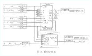 模60計數器由十進制計數器74160 和以上設計的六進制計數器組成(見圖3) ,當74160 計到9時,產生進位使6 進制電路能計數。