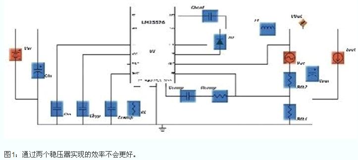 值得注意的是,高效率是84%,且此高效率是當輸入-輸出間的壓差很低時實現的。此例中,輸入/輸出比大于7。一般情況下,可以用兩級電路來降低級與級之間的比率,但通過兩個穩壓器實現的效率不會更好。