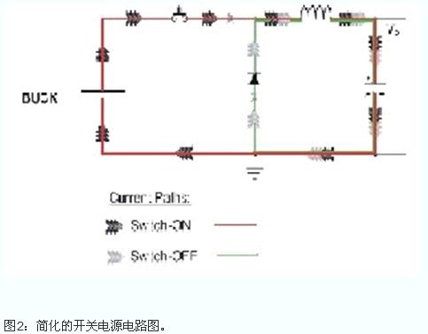 圖2所示的簡化電路圖對了解基本情況幫助甚大。看一看電流通路:把FET在導通狀態下的回路標記為紅色;把FET在截至狀態下的回路標記為綠色。我們可以觀察到兩種不同情況:有兩種顏色的區域和僅一種顏色的區域。我們必須特別關注后一種情況,因此時電流在零和滿量程之間交替變化。這些是具有高di/dt的區域。