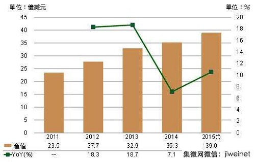 雖自2011年以來,全球智慧型手機出貨量年成長率即呈現逐年下滑態勢,但2015年預估仍能維持2位數年成長幅度,加上來自大陸IC內需市場規模亦持續成長,使得同期大陸IC設計業產值仍將能維持20%以上的成長動能。在大陸IC設計產業強勁成長帶動下,DIGITIMESResearch預估,2015年大陸晶圓代工產業產值將達39億美元,較2014年成長10.5%。